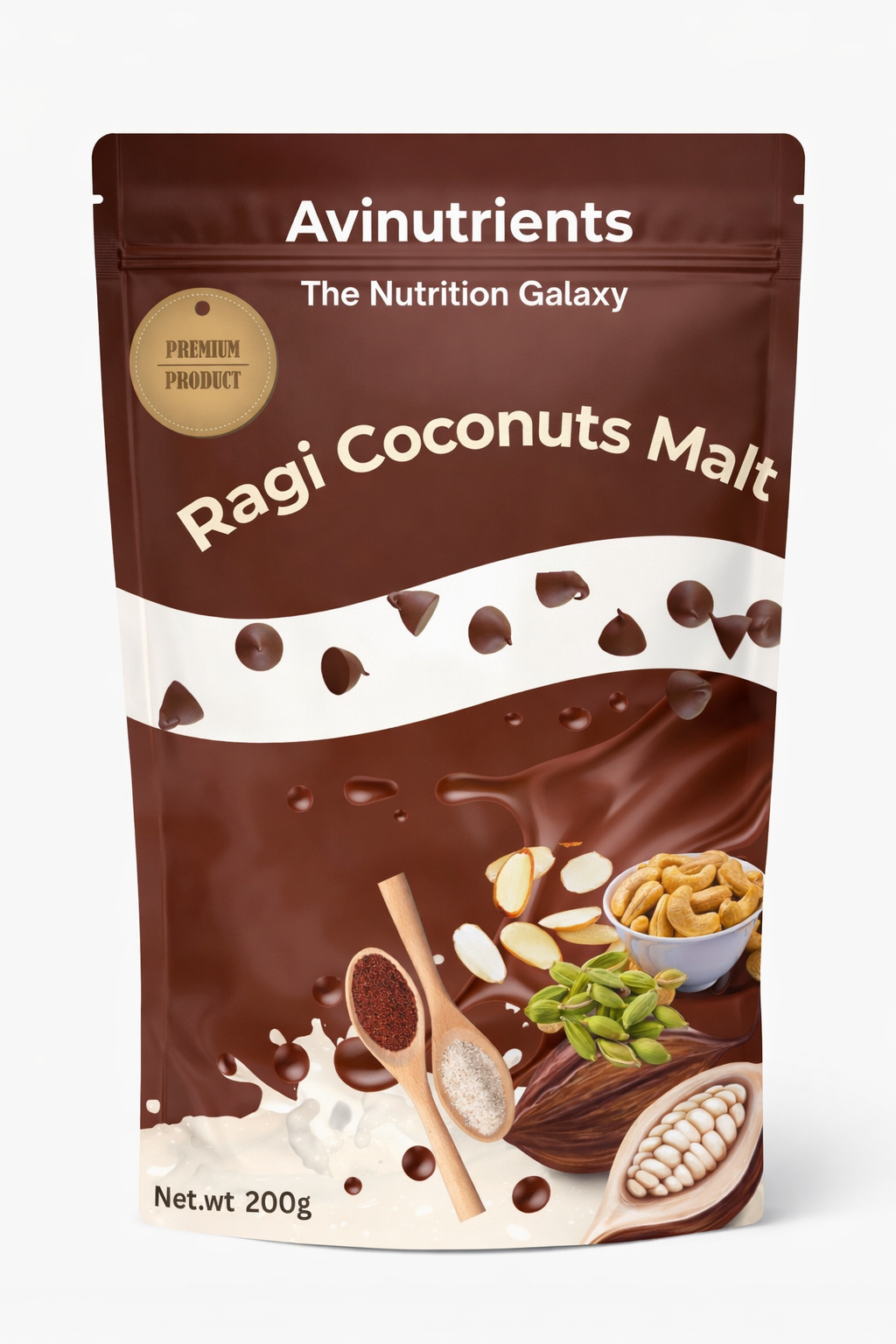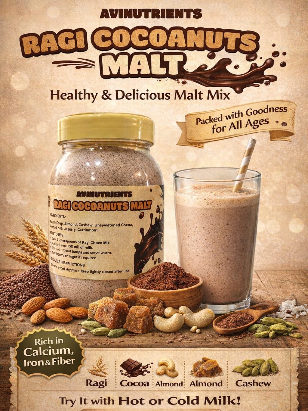 Ragi Coconuts Malt is a wholesome and energy-rich health drink made from sprouted ragi and natural coconut goodness. Packed with calcium, fiber, and essential nutrients, it supports bone strength, digestion, and overall vitality. With its smooth texture and rich nutty flavor, it’s a delicious and nourishing beverage for children, adults, and elders. Enjoy it hot or cold as a healthy start to your day.